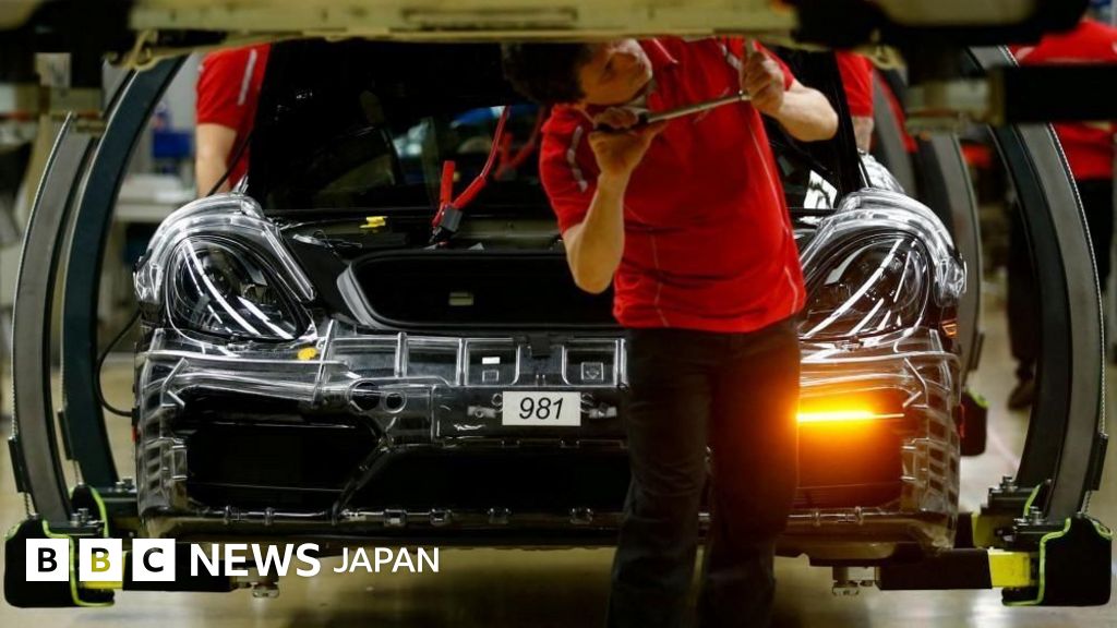 ドイツの自動車工場で、赤いTシャツを着た人が、車の底面に工具を当てている。背後には組み立て中の車両がある