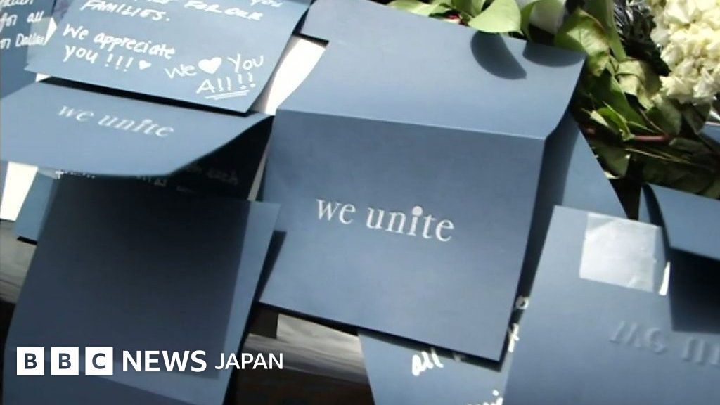 米テキサス州ダラスの銃撃事件で警官5人を失った市警本部前には、多くの市民が集まり、パトカーのまわりに花束やキャンドルを供えている。