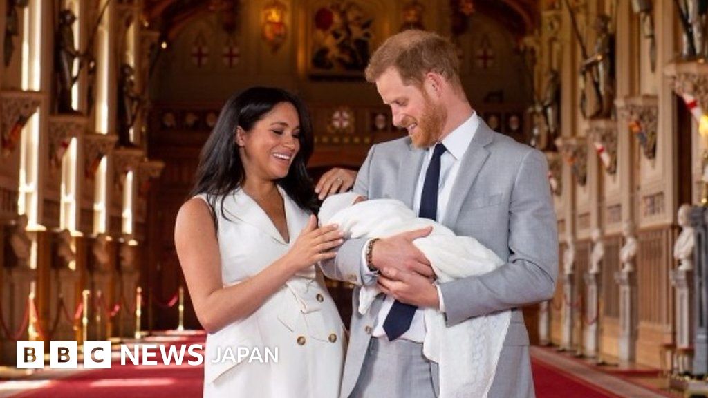 英王室のサセックス公爵夫妻、ハリー王子とメガン妃は8日、6日に生まれた第1子を抱いて、報道陣の前に姿を現した。