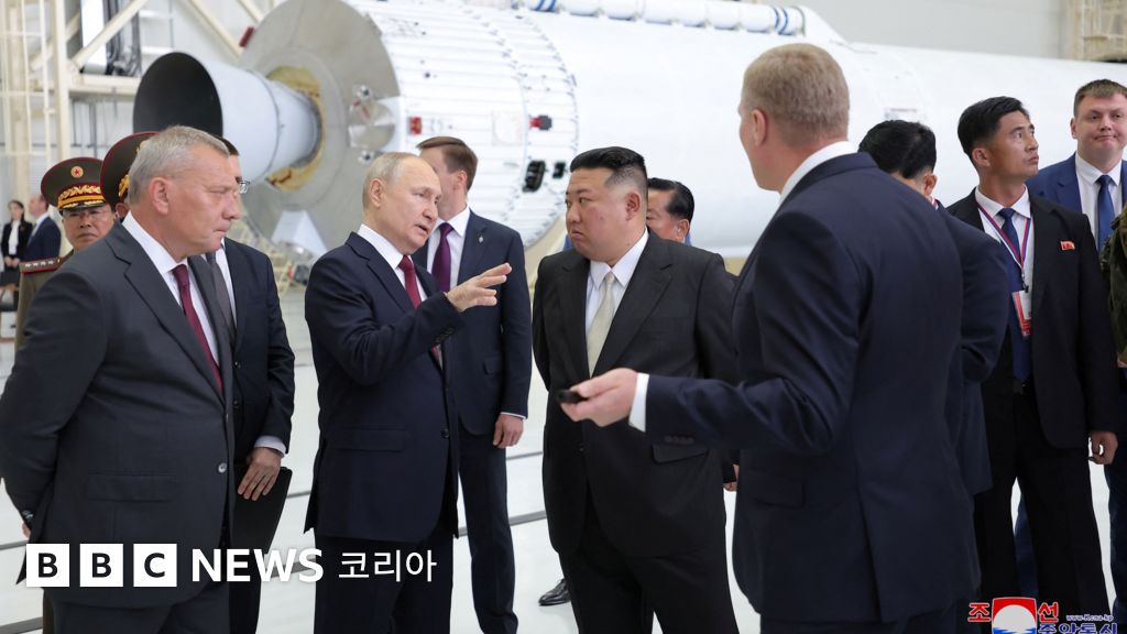 사진 설명, 보스토치니 우주기지에서 로켓 발사 시설을 둘러보는 김정은 위원장과 푸틴 대통령