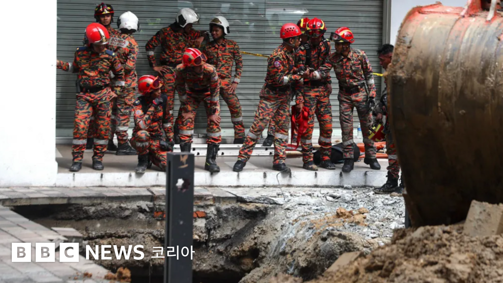 사진 설명, 말레이시아 소방 당국이 쿠알라룸푸르의 싱크홀 사고 현장을 조사하고 있다