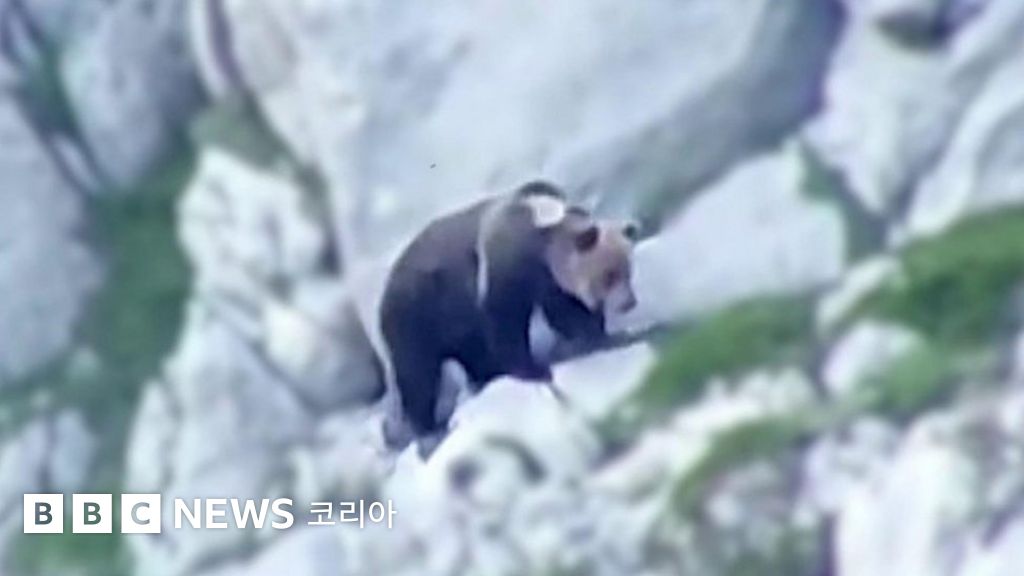 두 마리의 곰이 가파른 스페인 칸타브리아 산 절벽에서 맞붙었다.