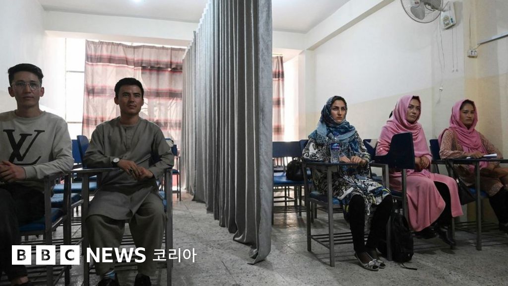 사진 설명, 몇몇 사립대학에서는 탈레반의 성별 분리 정책에 따르기 위해 교실에 장막을 설치했다