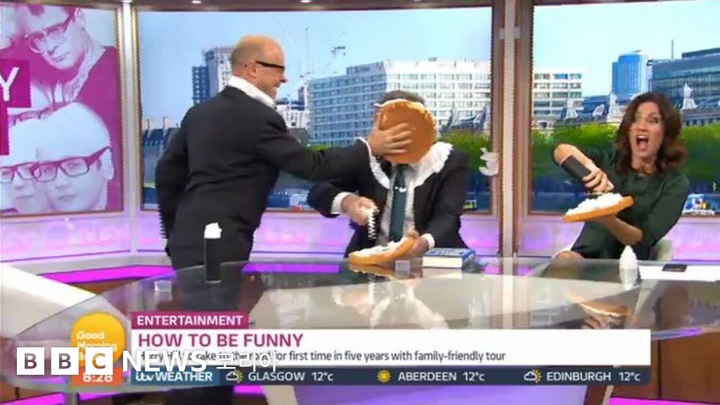 힐은 지난 수요일 영국 TV 방송 '굿모닝 브리튼'(Good Morning Britain)에 출연해 진행자 모건을 향해 생크림을 잔뜩 얹은 파이를 던졌고, 예기치 못했던 상황에 모건은 당황했다.