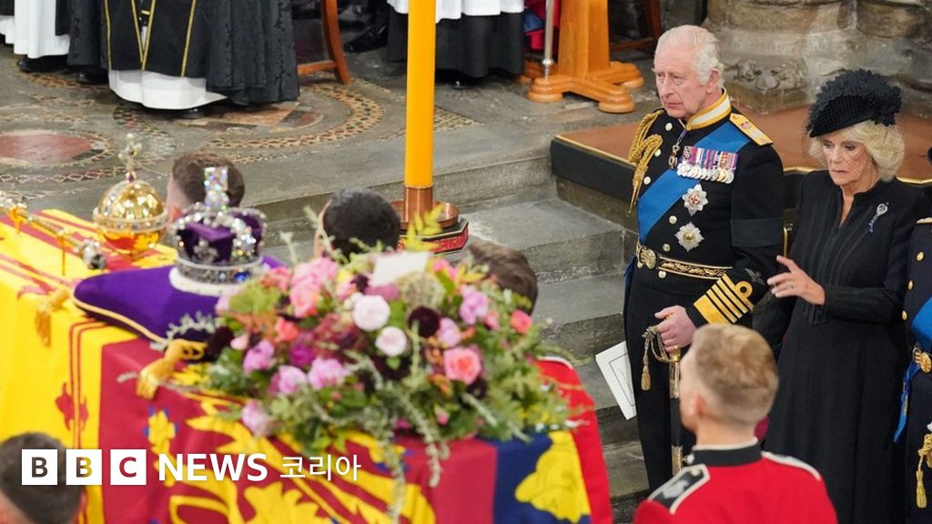 찰스 3세 국왕은 웨스트민스터 홀에서 사원까지 어머니의 관 뒤에서 엄숙한 행렬을 이끌었다.