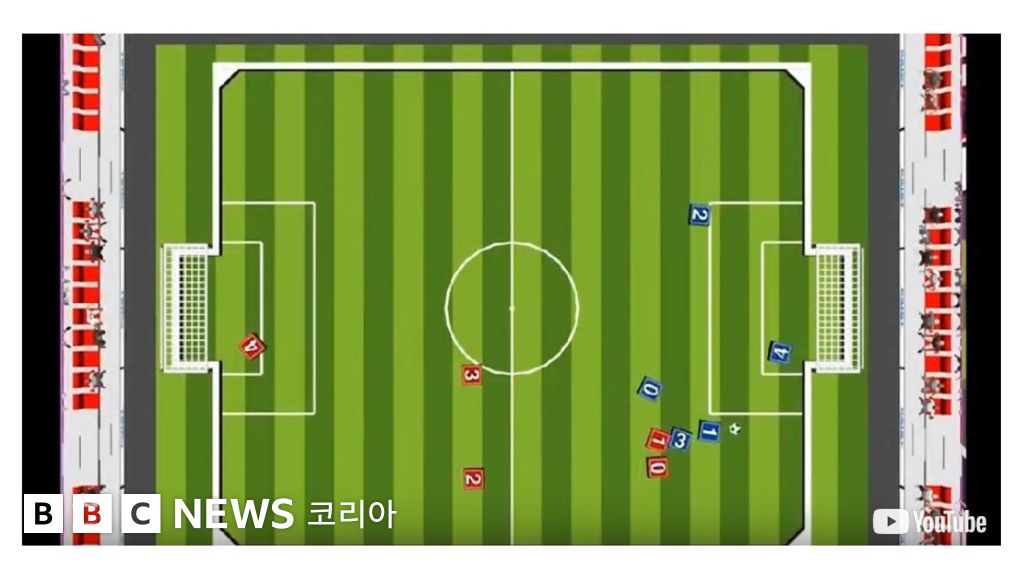 경기 초반엔 양팀은 공을 앞에 두고도 공격을 하지 않지만 경기가 진행되면서 컴퓨터는 어떤 상황에서 어떤 동작이 득점으로 이어질 지 스스로 학습합니다.
