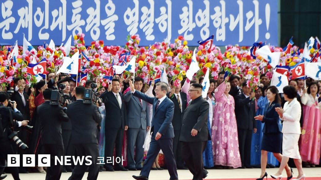 지난 18일 오전 10시께, 한국 문재인 대통령의 방북을 환영하는 인파 속에 한 현수막이 눈에 띄었다.