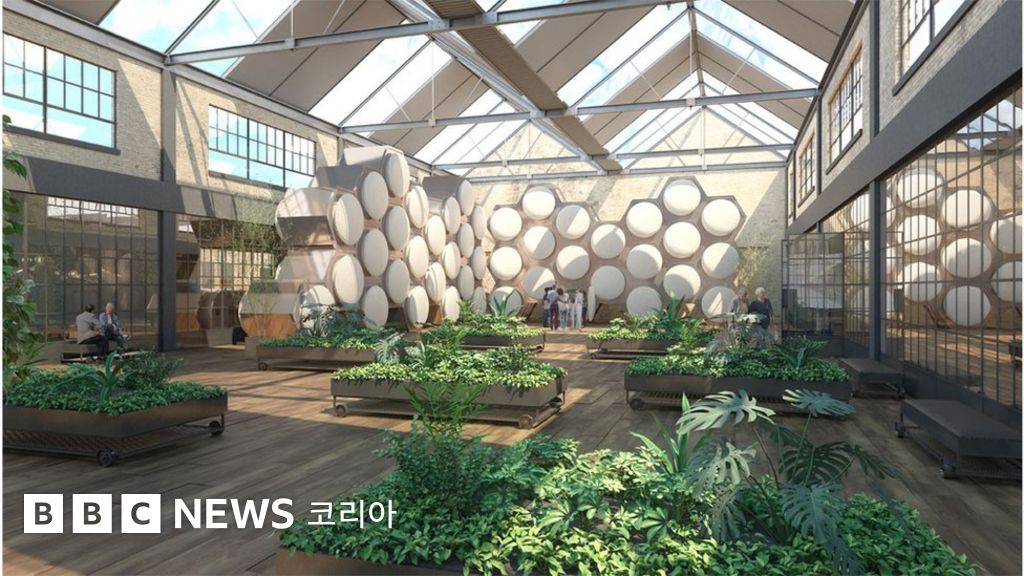 벌집 형태의 구조물이 벽을 따라 놓여있는 실내 정원의 모습이다.