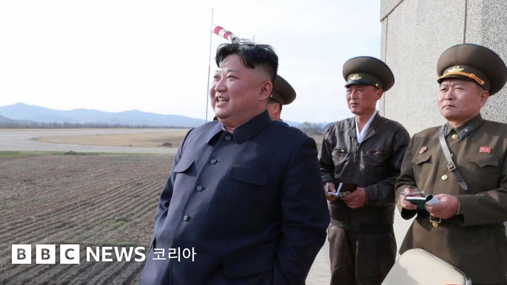 사진 설명, 북한 김정은 국무위원장이 지난 4월 조선인민군 항공군의 비행 시험을 참관하고 있다