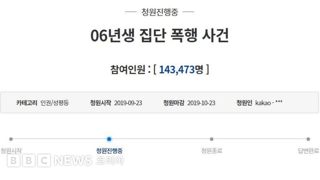 23일 청와대 국민청원 게시판에는 가해자 학생들의 "엄중 처벌"을 요구하는 "06년생 집단 폭행 사건"이라는 청원이 올라왔고, 이날 오전 11시 기준 14만3천여명이 동의한 상태다.
