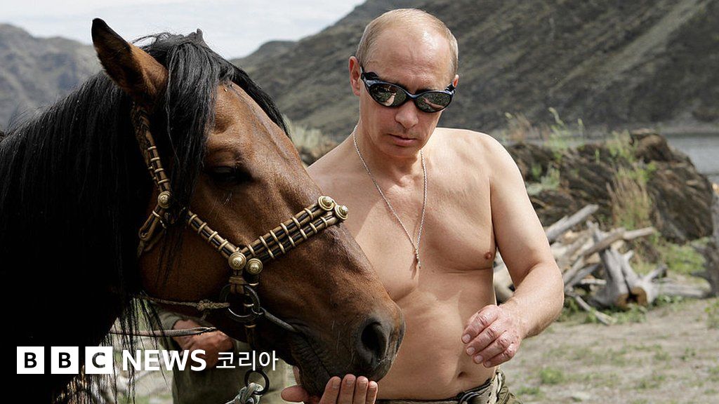 사진 설명, 2007년 푸틴이 상의를 벗고 군복 하의만 입은 채 몽골리아 초원에서 사냥을 즐기고 있다