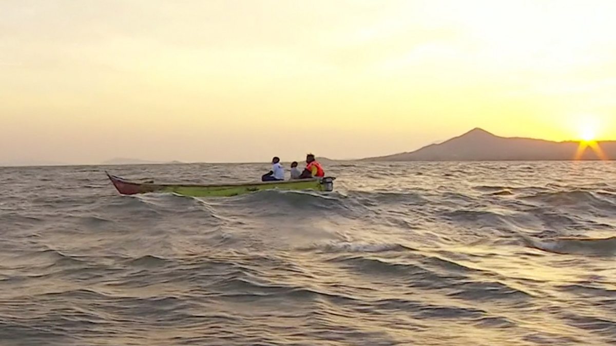 Sunrise – and these fishermen are making their way back to shore after a night out on the water – ready to sell their catch at the market.