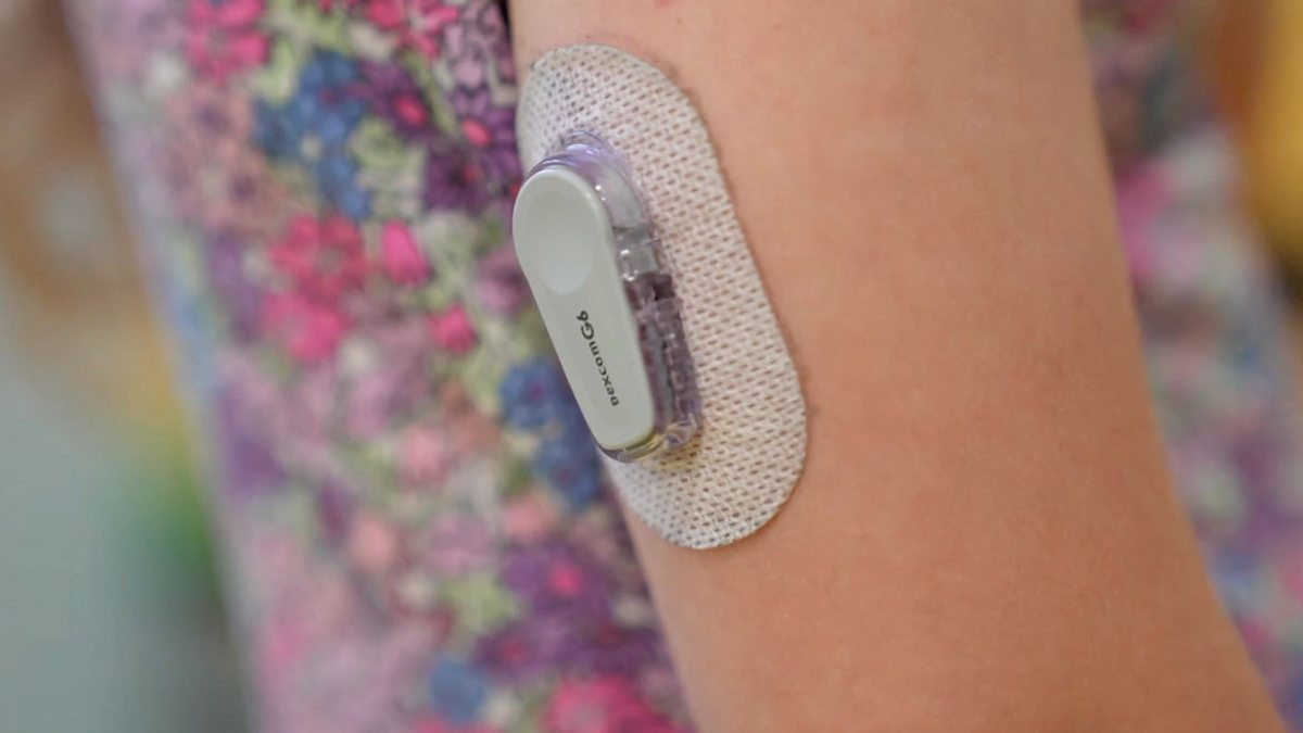 As part of a trial, she has a sensor on her arm which continuously monitors her blood glucose, and sends readings to this pump, which automatically delivers the insulin she needs.