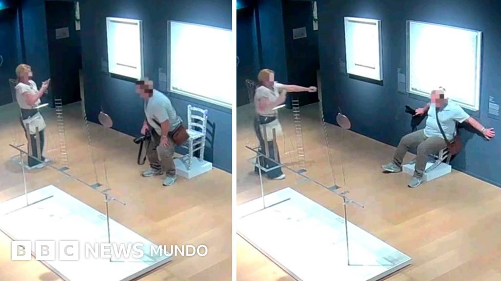 Cuando el hombre está haciendo lo que el museo describió como un "gesto irresponsable", parece resbalar y caer sobre el asiento, rompiéndolo.