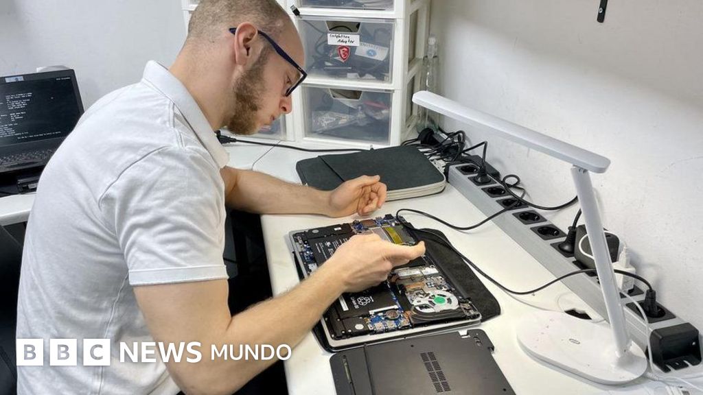 En la parte trasera del taller, Lukas, un técnico, inspecciona el tablero matriz de una laptop vieja. Alrededor de él hay montones de cajas llenas de computadoras y teléfonos que han traído para reparar.