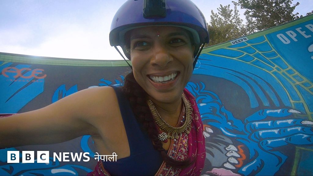 सारी लगाएर स्केटबोर्डिङ गर्ने ४० कटेकी महिला