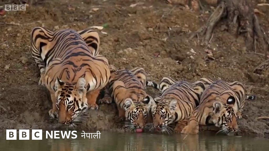 भारतको महाराष्ट्र राज्यमा रहेको एउटा वन्यजन्तु निकुञ्जमा यो बघिनी आफ्ना डमरुहरूसँग पानीमा यसरी रमाउँदै छे।
