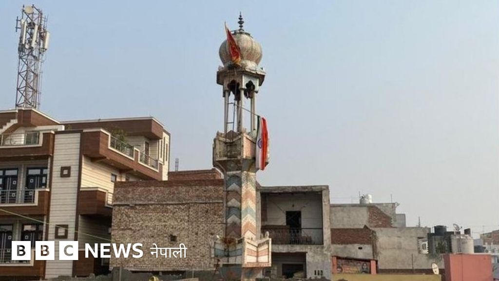 मस्जिदको मिनारमा भारतको राष्ट्रिय झन्डा र सिन्दूरे रङ्गको अर्को झन्डा लगाइएको देखिन्थ्यो।