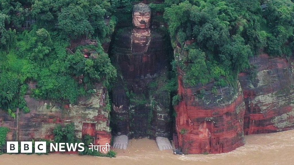 चीनमा बुद्धको भीमकाय मूर्तिको पाउसम्म बाढी
