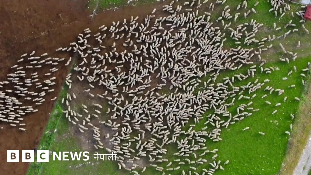भिडिओ क्याप्शन सुरु हुँदैछ, भेडाको बथानको ड्रोनबाट खिचेको रमाइलो दृश्य