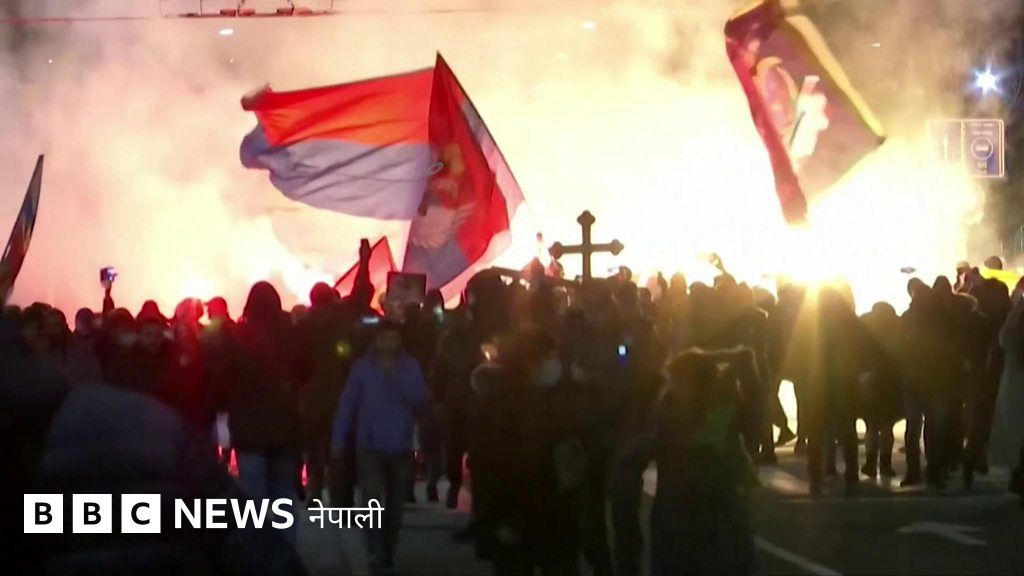 हजारौँ मानिसहरू सर्बियाको राजधानी बेलग्रेडमा रुस समर्थक प्रदर्शनमा सहभागी भएका छन्।