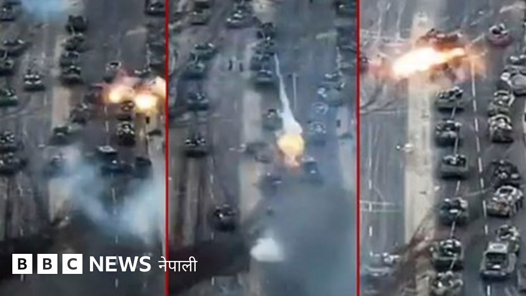 ब्रोभरी क्षेत्रमा रुसी ट्याङ्ककको लस्करलाई युक्रेनी फौजले आक्रमण गरेको ड्रोन फूटेजमा देखिन्छ।