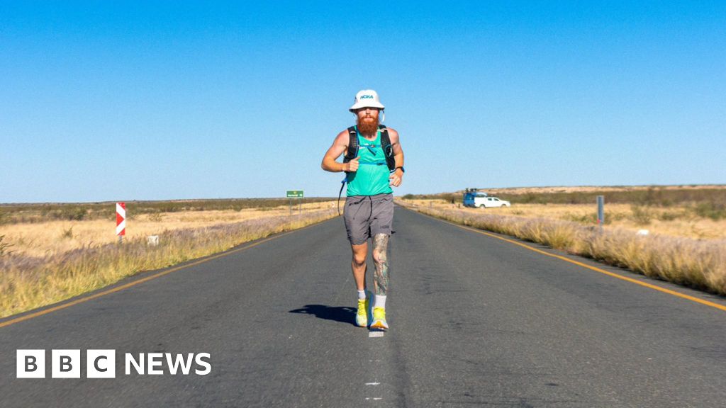 Harry GallimoreMr Cook will run 9,320 miles (14,500km) during the challenge, crossing 16 borders - through cities, rainforests and a three-month stretch in the Sahara Desert.