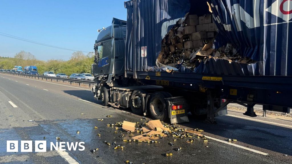 One HGV had its empty shipping container knocked sideways, while the other, which was carrying 20 tonnes of Italian sparkling white wine, was smashed on one side, leaving broken glass bottles and drink across the M4 in Berkshire.