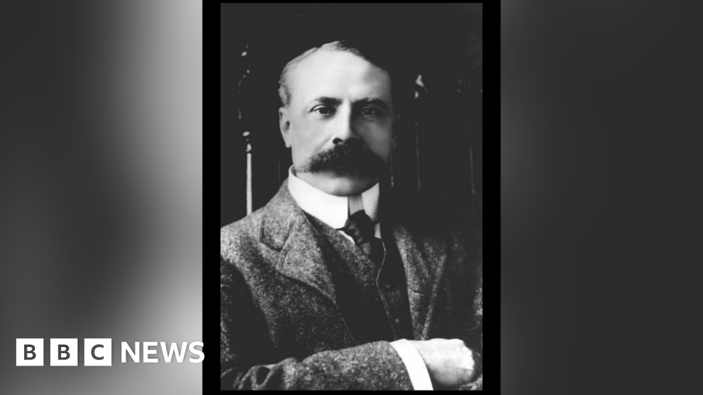 BBC A black and white photo of Sir Edward Elgar wearing a grey suit. He has swept back short hair and a long, thick moustache.BBC