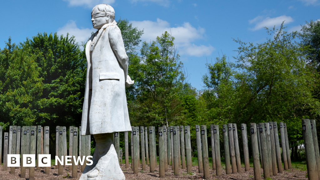 The memorial features a statue of a young, blindfolded soldier, with six conifer trees in front to represent a firing squad, and 309 stakes behind, bearing the names of those who were executed.