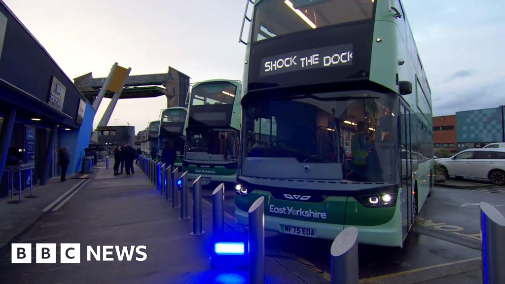BBC Several green buses are lined up outside The Deep aquarium, one of them is displaying 'shock the dock' on its display board.BBC