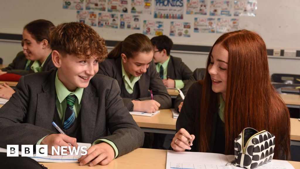 Furness Education Trust Pupils sat at their desks in a classroom at Walney School. Two pupils in the foreground, a boy and a girl, are looking at each other and smiling. Other pupils are writing and talking to each other. They all wear green shirts with black, blue and green ties and grey blazers.Furness Education Trust