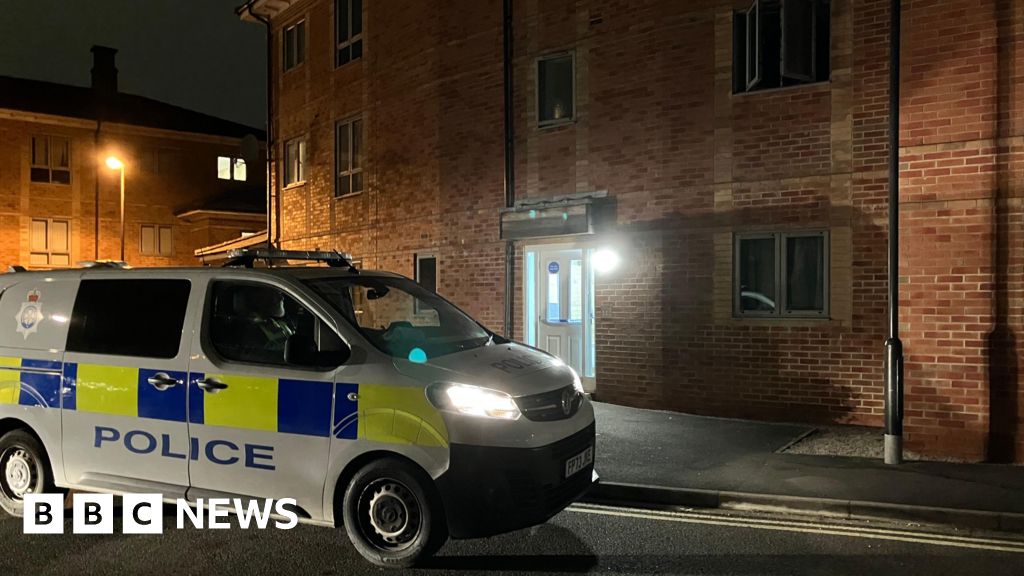 Seb Cheer/BBC A police van parked on a residential street at night. The van is marked with blue and yellow panels and the word “POLICE”, and its headlights are switched on. Behind it is a red-brick apartment building with a lit entrance and several windows visible.