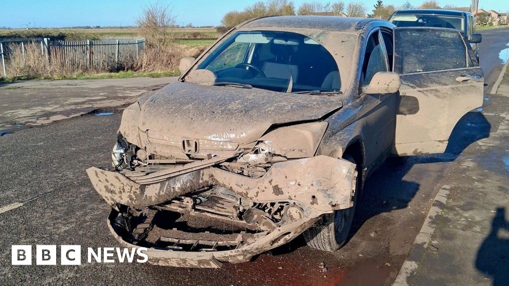 Charlie Marks A dark-coloured Honda car caked in mud, its front bumper hanging off, parked by a roadside in the Fens.Charlie Marks