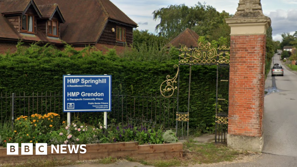 Google The front entrance of a jail with a sign saying HMP Springhill and HMP Grendon. Behind the sign is a hedge and railings with a house beyond. There is a red brick column to the right of the sign and a long straight road with a car on it. Google