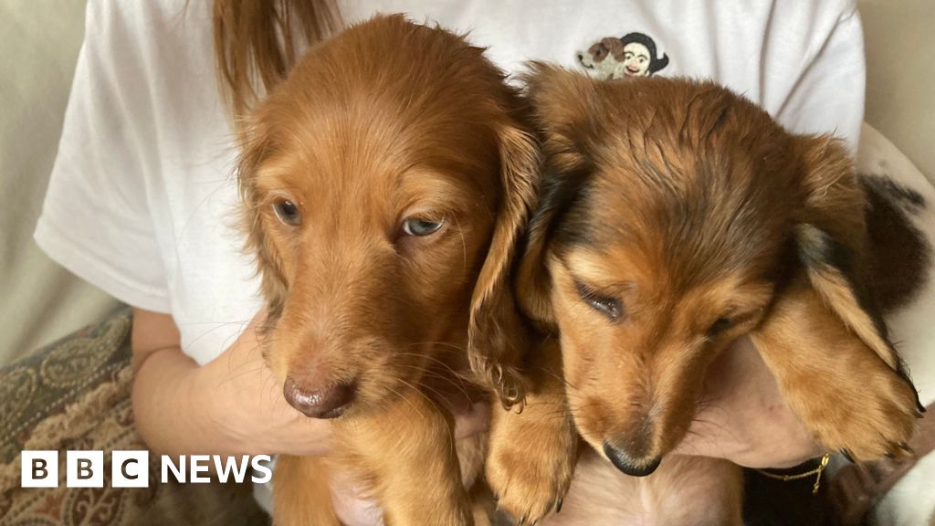 BBC Two caramel coloured long-haired dachshund puppies are being held in a woman's hands, she is wearing a white T-shirtBBC