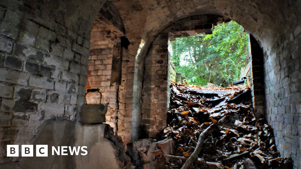 The ice house has an ornate brick frontage which has crumbled.