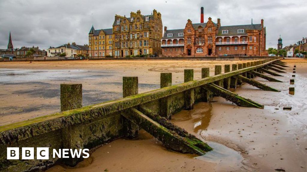 SSPCA View of Portobello Beach in Edinburgh, Scotland, featuring a wooden groyne leading towards historic Victorian-style buildings under a cloudy skySSPCA