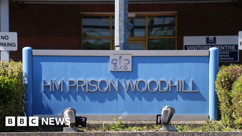 PA Media Blue sign with grey writing reading HM Prison Woodhill. There are lights at the bottom of the sign pointing upwards and hedges either side. PA Media