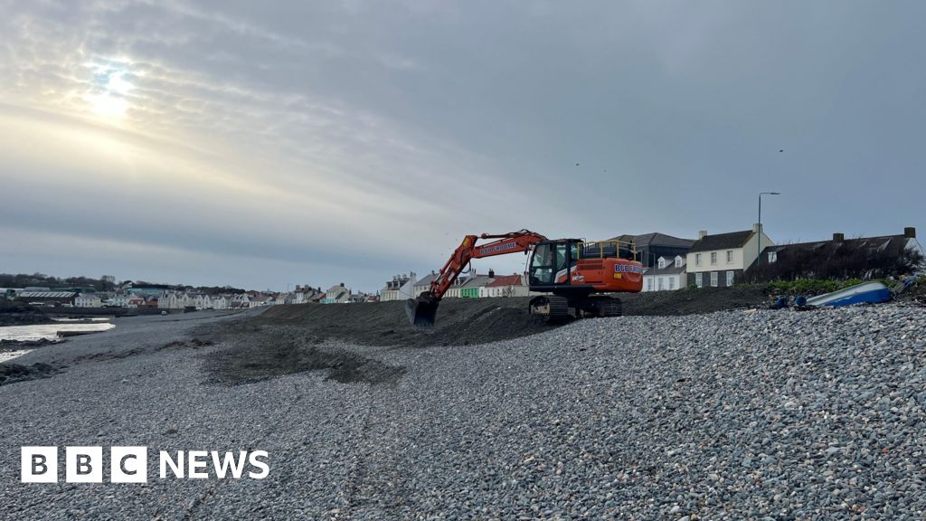 BBC A digger on a rocky beach. There are houses in the background. The sky is grey and the sun is seen through the clouds. BBC