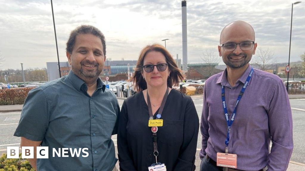 University Hospitals of North Midlands NHS Trust A woman and two men stand together in a hospital car park and smile at the camera. University Hospitals of North Midlands NHS Trust