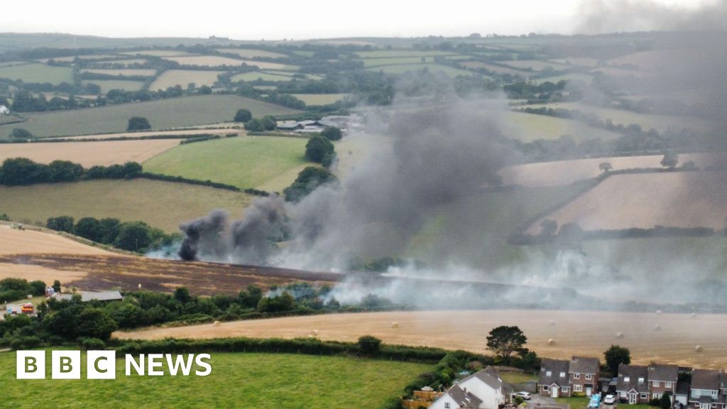 Brian ClarkA combine harvester fire spread to surrounding fields and closed the main railway line in and out of Cornwall.