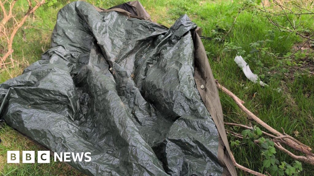 Cumberland Council A discarded tarp of a tent is covering greenery. There is also litter left nearby the branch. Cumberland Council