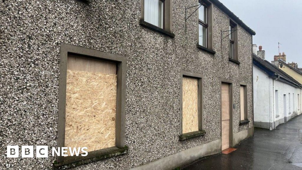 BBC House in Broughshane showing wooden boarded up windows at the bottom. The house has a pebble dash effect.BBC