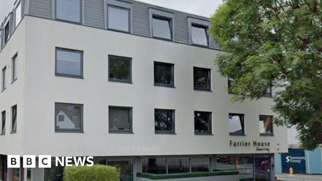 Google A rectangle-shaped building which is light grey and over several floors. There are green bushes outside and a sign on the building says Farrier House. Google