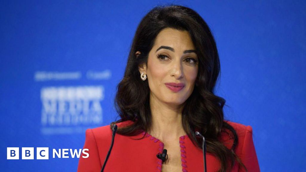 Getty Images Amal Clooney wears a smart red jacket, and stands at a podium, possibly giving a speech. She has long dark hair which comes past her shoulders.Getty Images