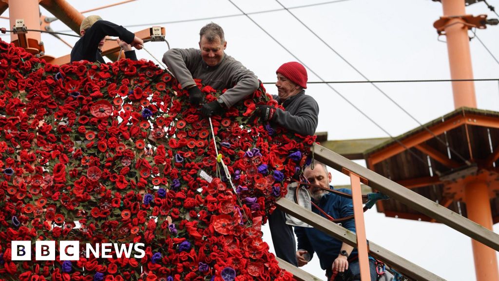 On Saturday, a team of eight attached three nets - each containing hand-made poppies - to the side of Altitude 44, a 69ft-tall (21m) high-wire activity in Skegness.
