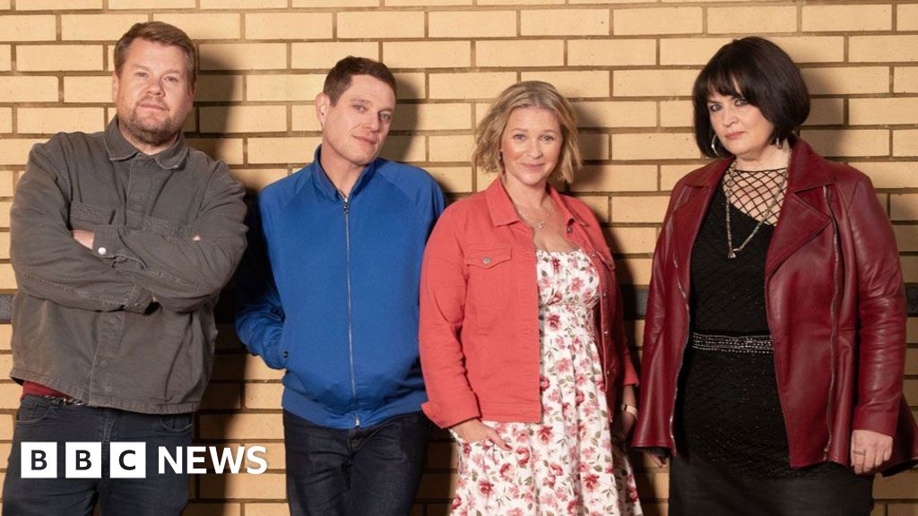 Smithy, played by James Corden, and Mathew Horne as Gavin are leaning against a brick wall alongside Joanna Page's Stacey, and Nessa, the role taken by Ruth Jones.