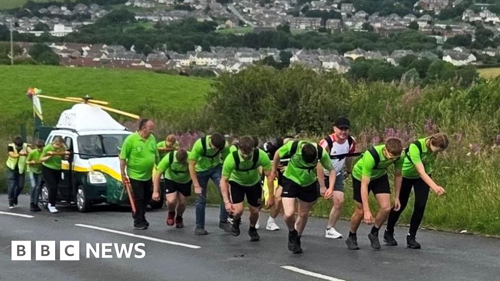 Sixty-four members of the Drigg Young Farmers Club (YFC) in Cumbria took turns pulling an adapted car, which had been transformed into a model helicopter, from their village to the Great North Air Ambulance Service (GNAAS) base in Langwathby at the weekend.