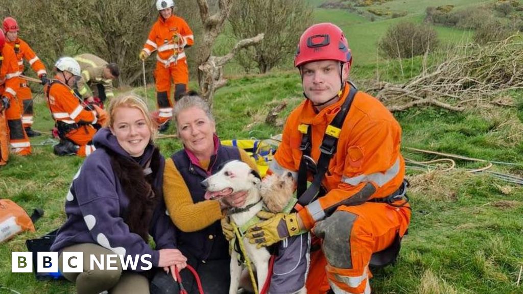 A firefighter was lowered down and placed the four-legged friend in a rescue bag before lifting her back up to be reunited with her owners.
